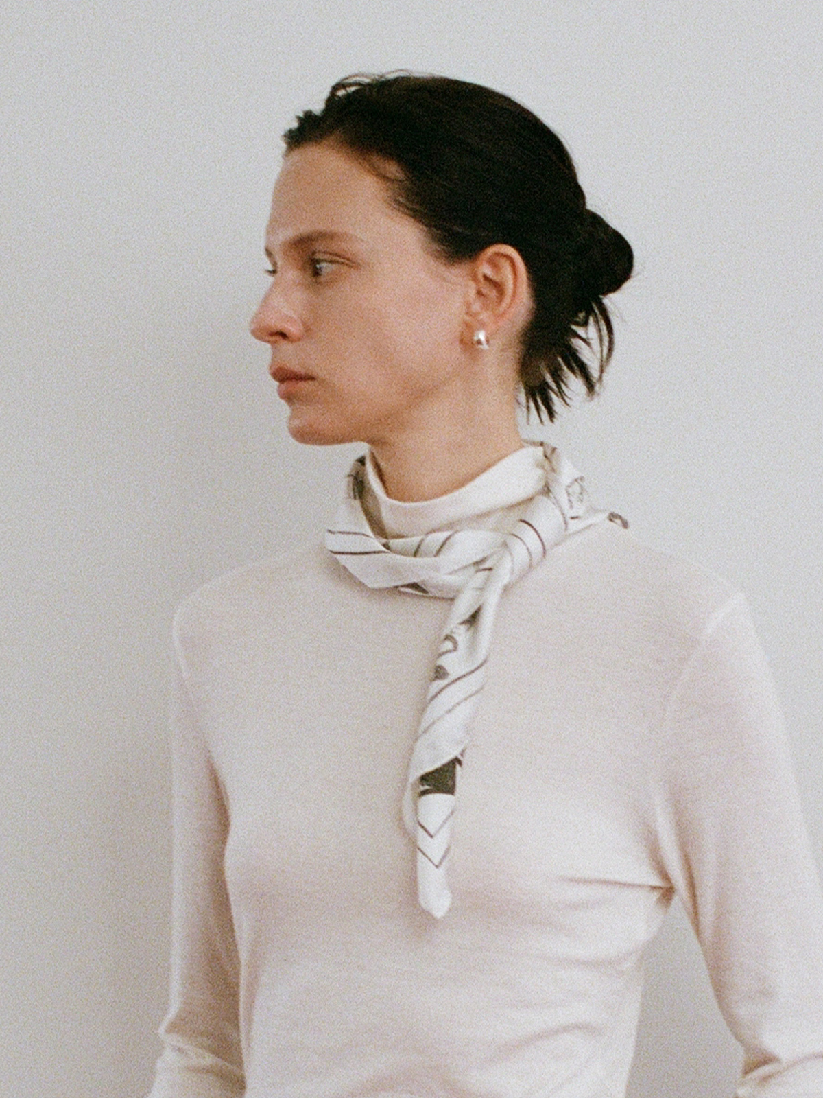 감각적인 드로잉이 담긴 실크 터치 스카프입니다.