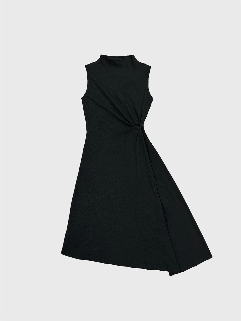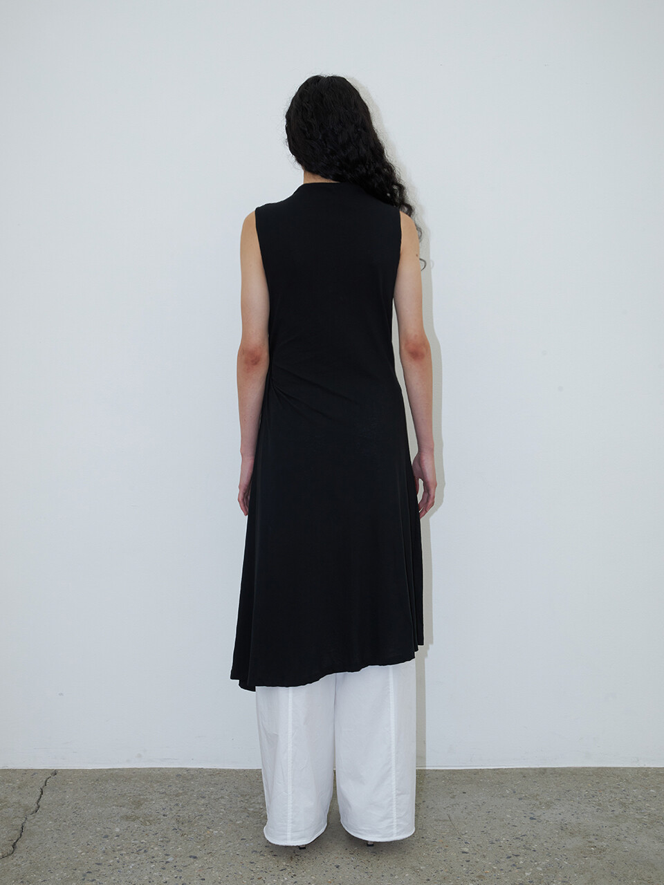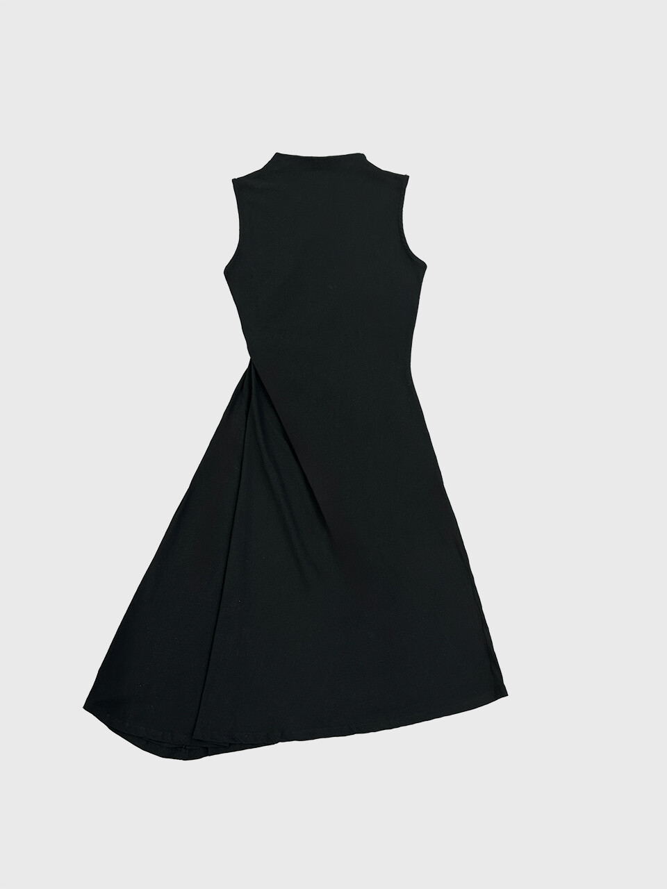 코튼 100% 소재로 제작된 하이넥 슬리브리스 롱 드레스입니다.