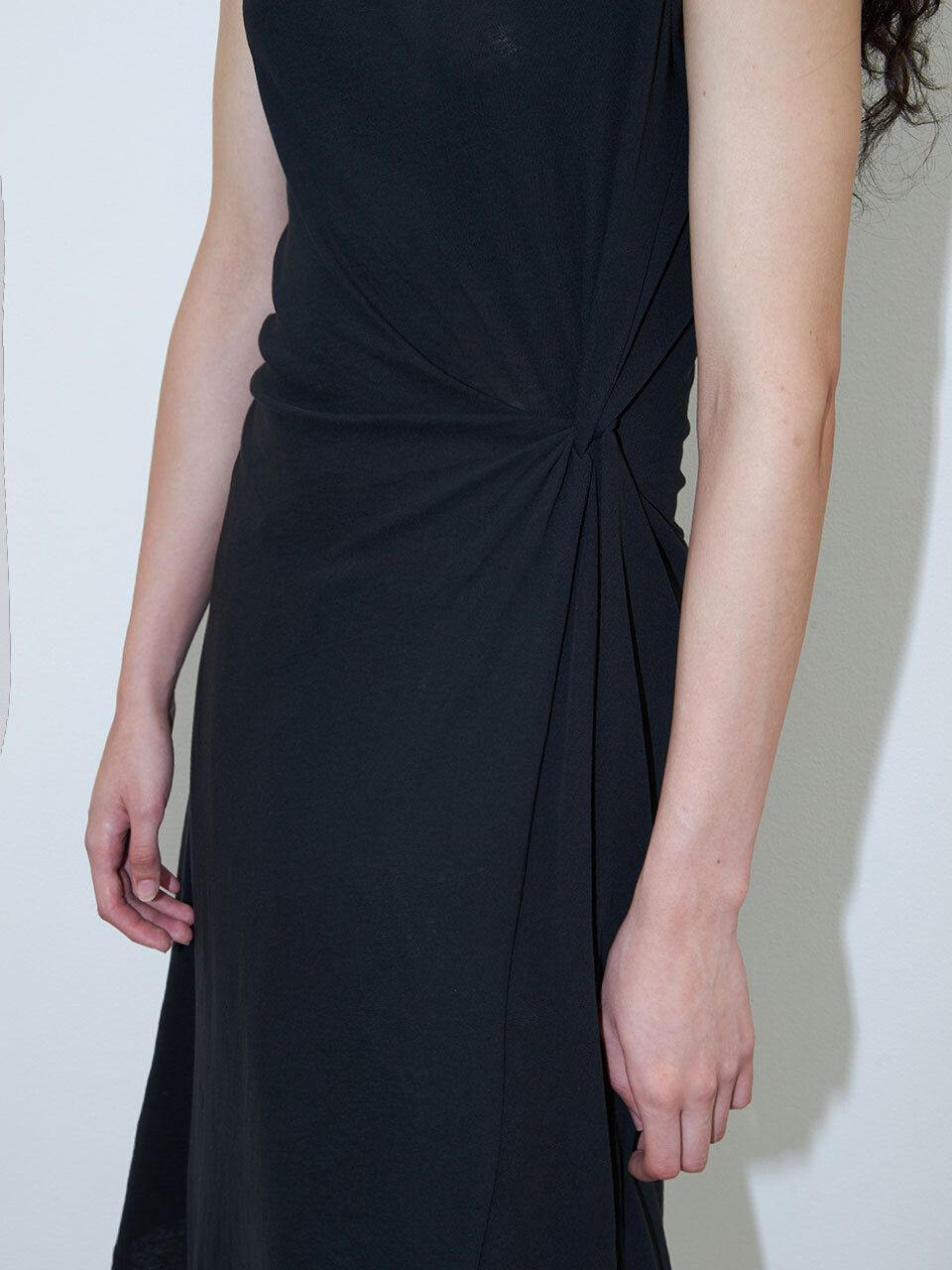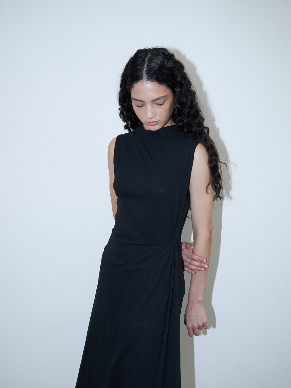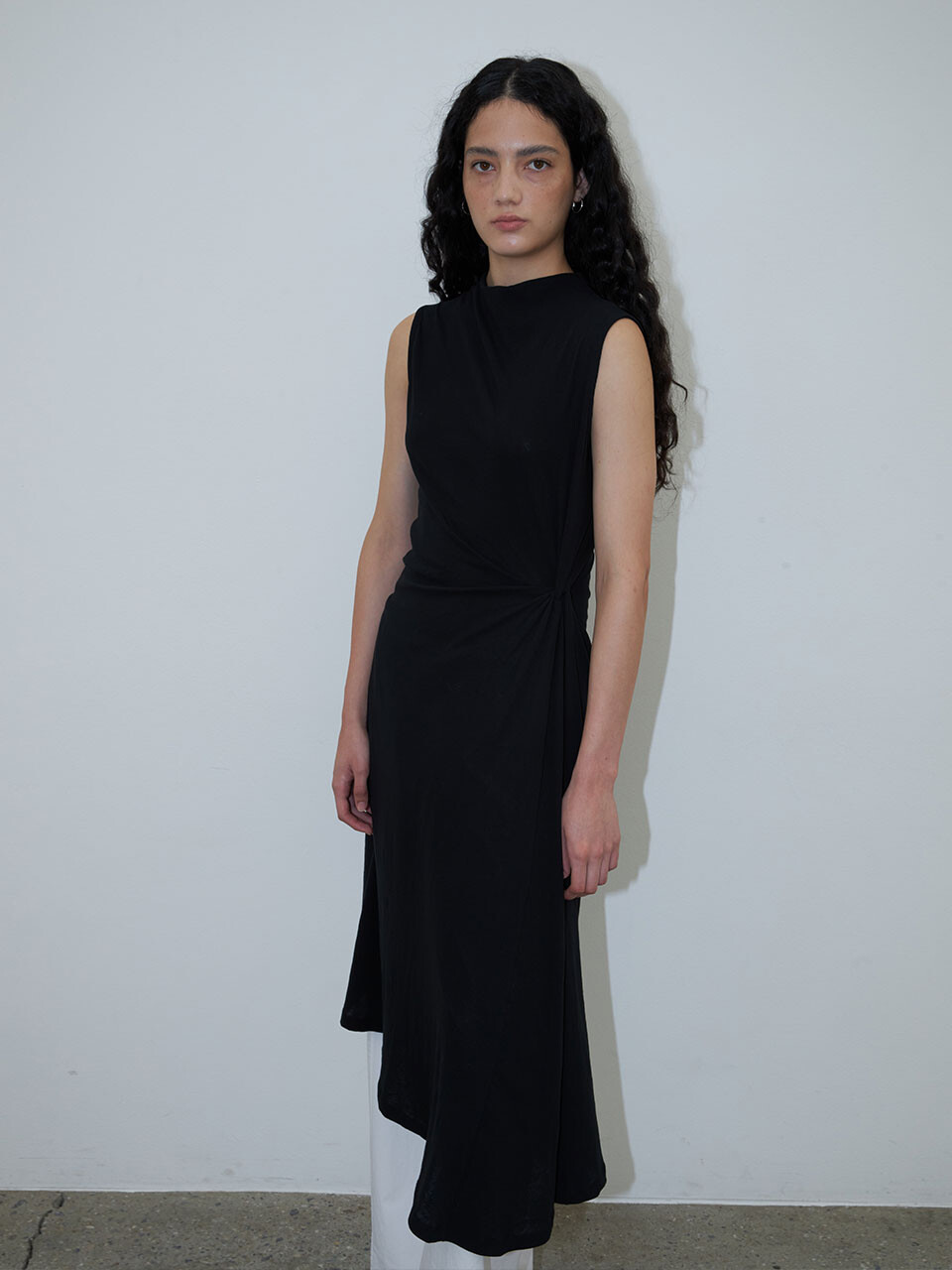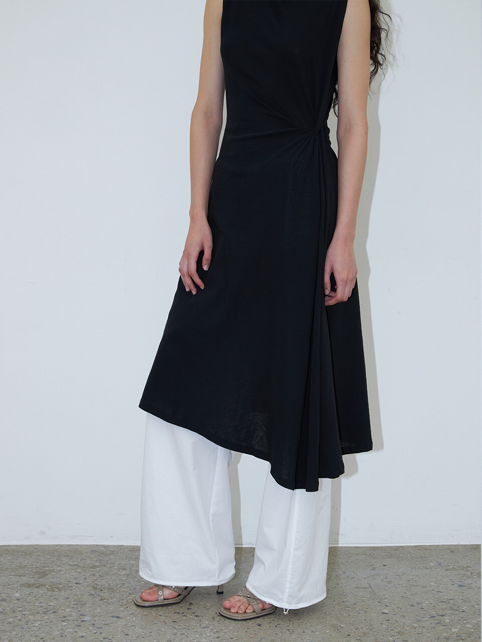 허리 한쪽에 잡힌 꼬임 디테일이 절제된 드레이프를 연출하며, 단정하면서도 감각적인 인상을 더해줍니다.