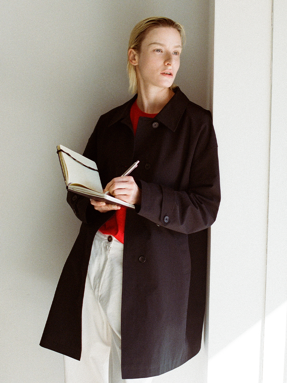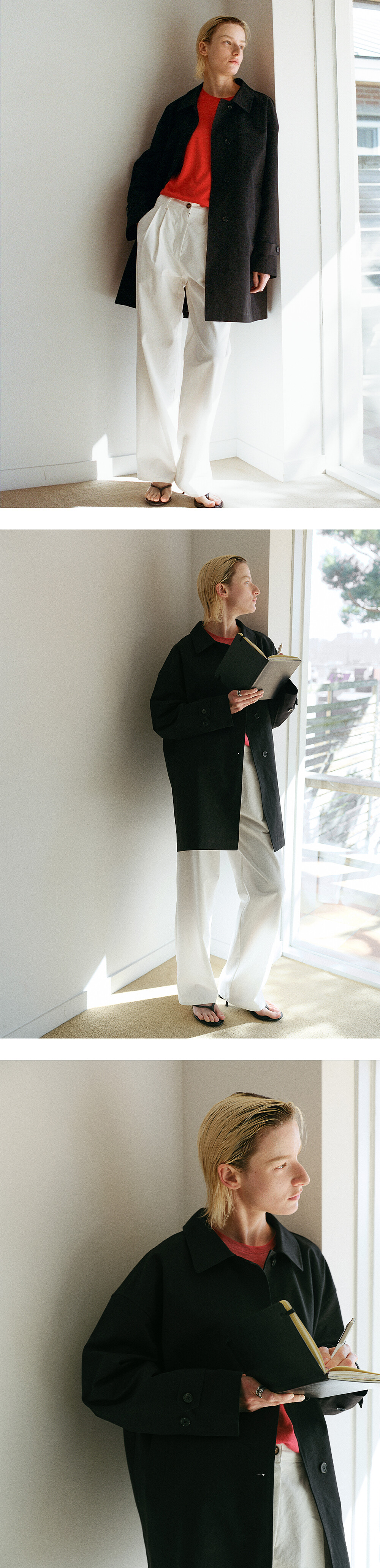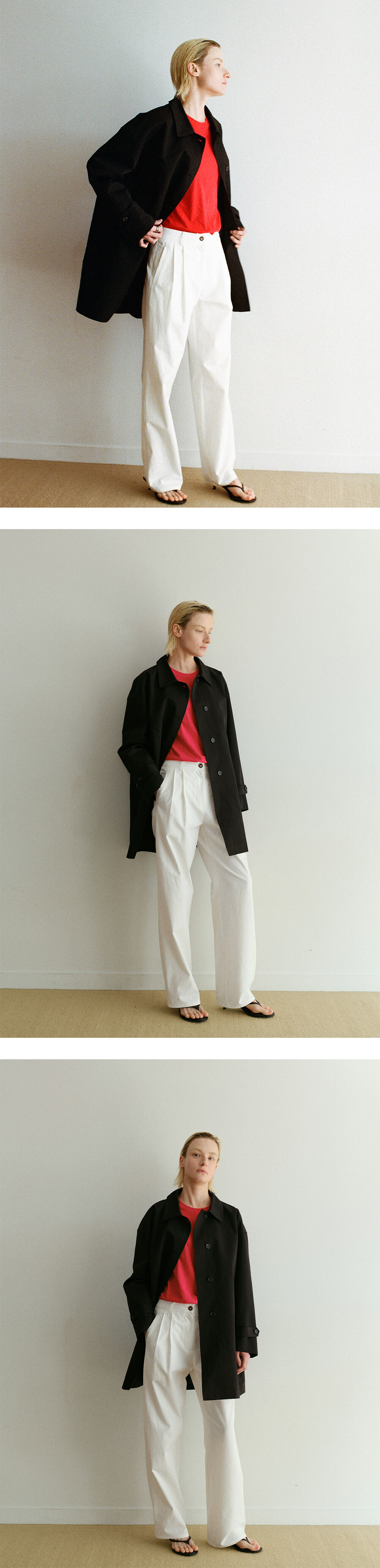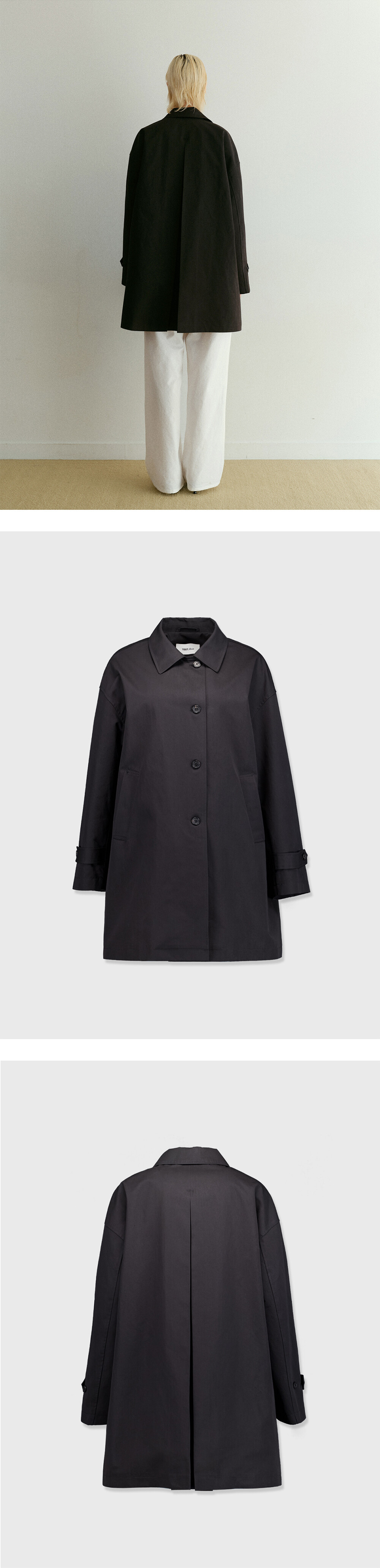 면과 폴리를 블렌딩한 고밀도 트윌 소재로 완성된 싱글 트렌치 코트입니다. 촘촘한 조직감이 탄탄함과 부드러움을 동시에 담아내며, 과하게 무겁지 않은 힘 있는 구조가 자연스럽게 흐르는 실루엣으로 이어져 현대적이면서도 우아한 라인을 완성합니다.