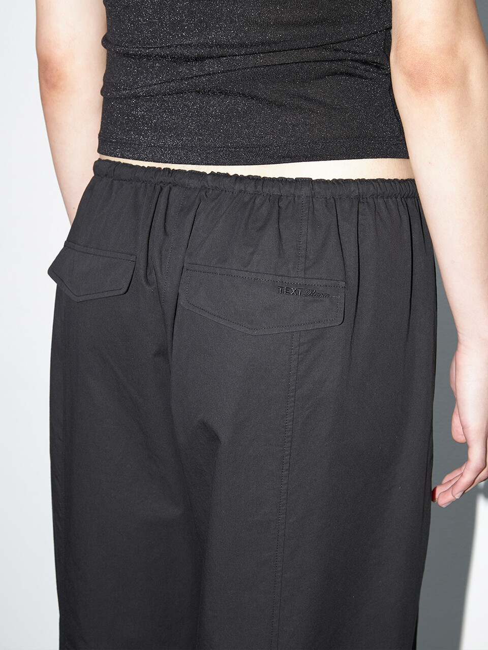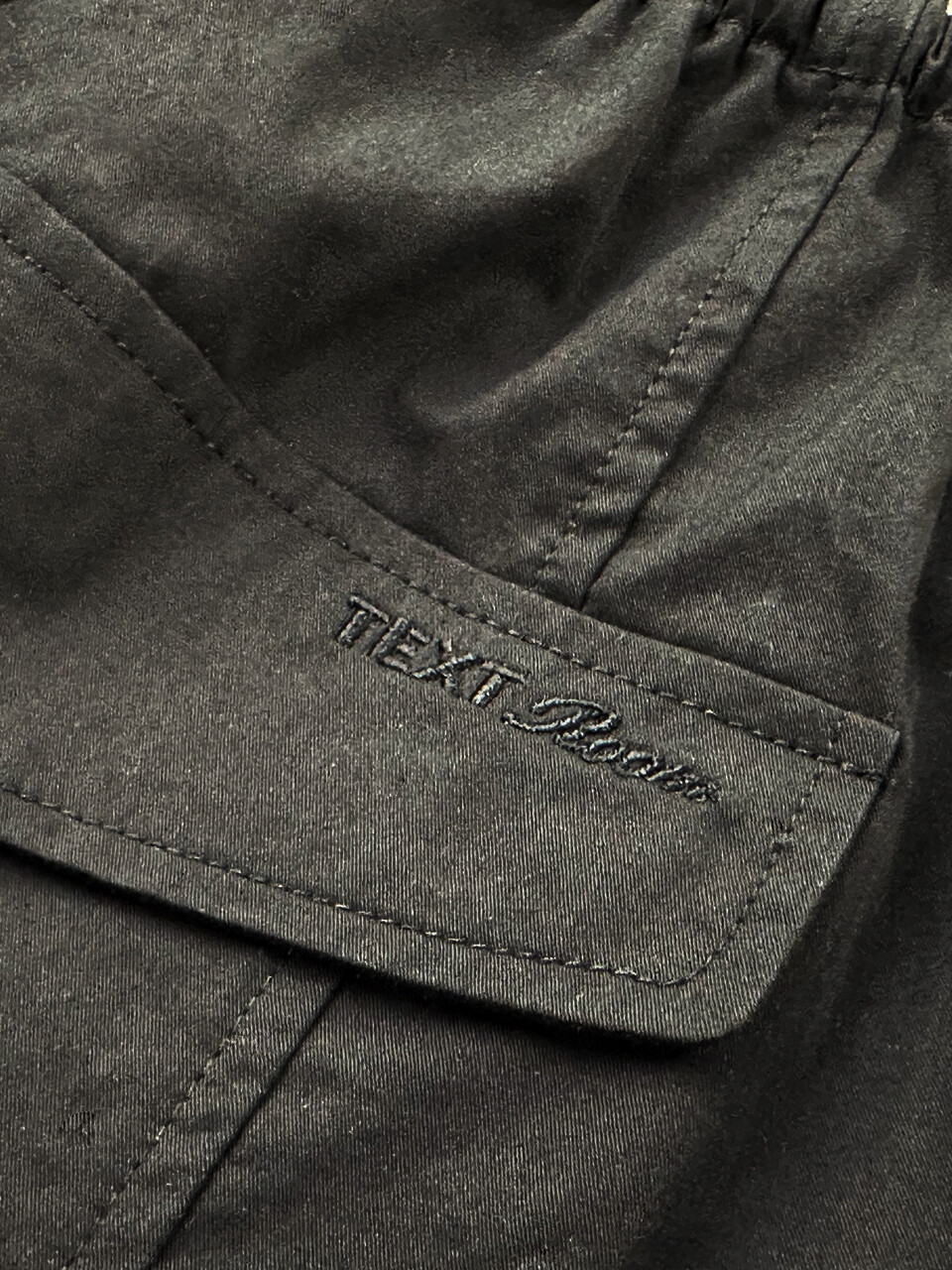 뒷면 플랩 포켓과 허리의 텍스트룸 로고 자수 디테일이 은은한 완성도를 더하며,