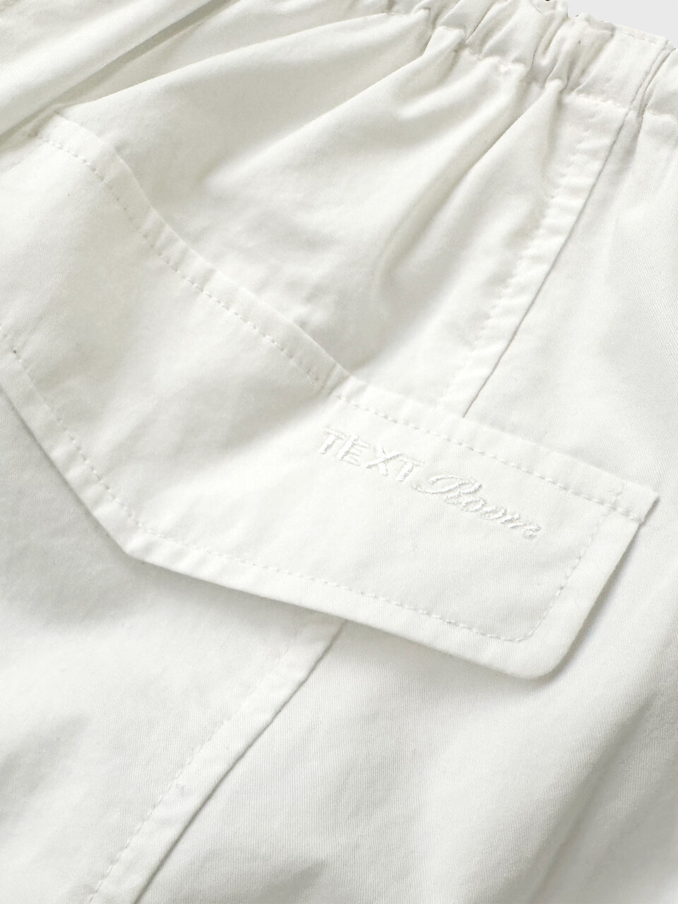 뒷면 플랩 포켓과 허리의 텍스트룸 로고 자수 디테일이 은은한 완성도를 더하며,