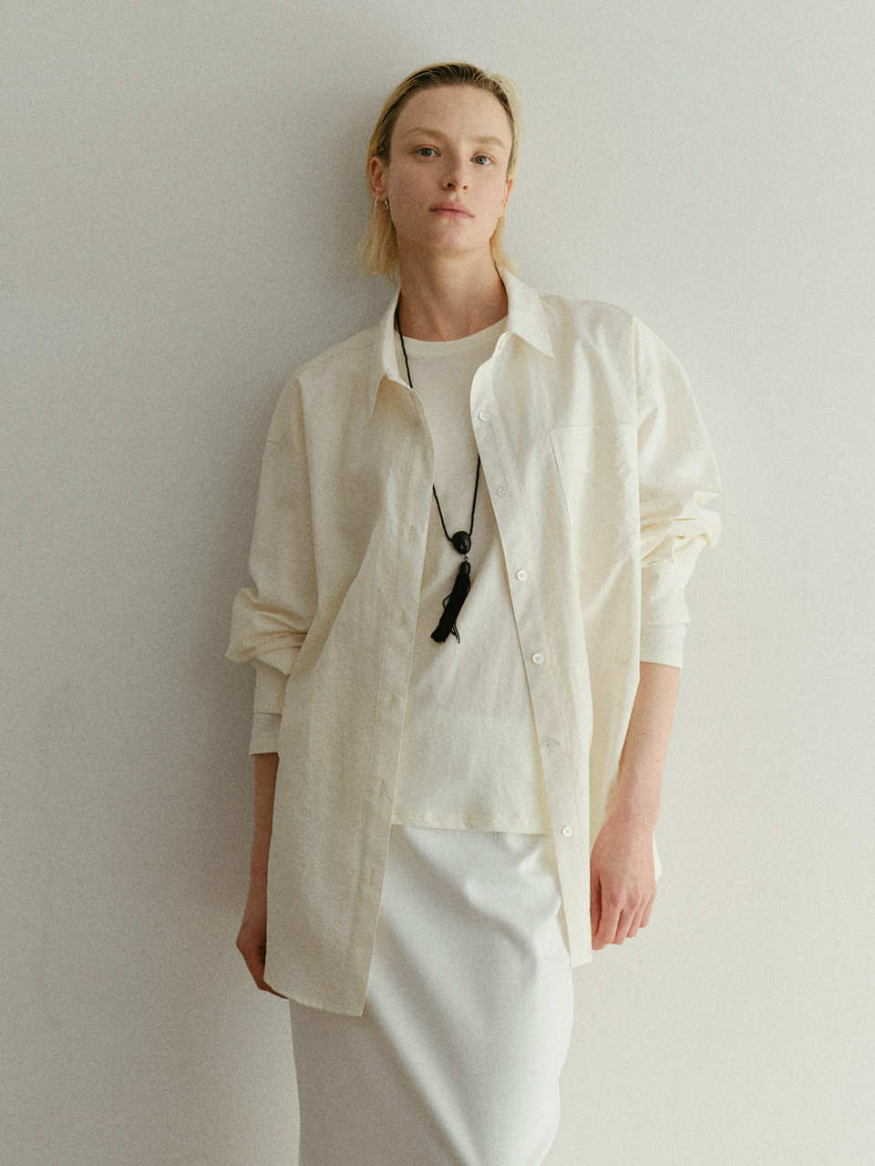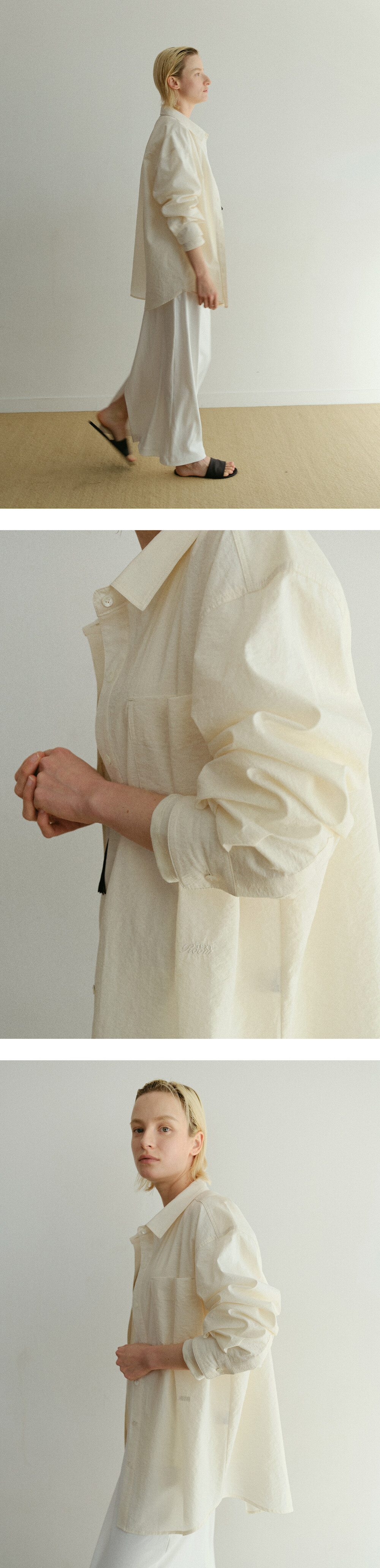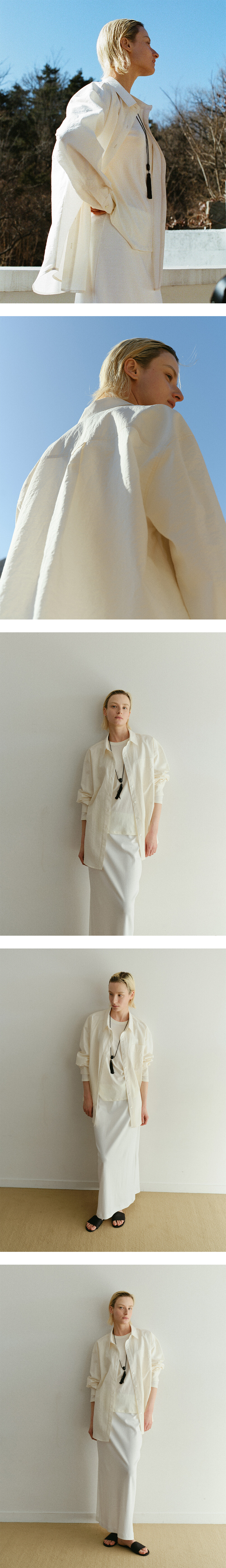 아주 얇고 부드럽지만 바스락거리는 질감이 살아 있는 코튼 나일론 혼방 소재로 완성한 페이퍼 셔츠입니다. 하늘하늘하게 흐르는 소재감과 자연스러운 울퉁불퉁한 텍스처가 조화를 이루며, 입는 순간 편안함과 세련된 감각을 동시에 선사합니다.