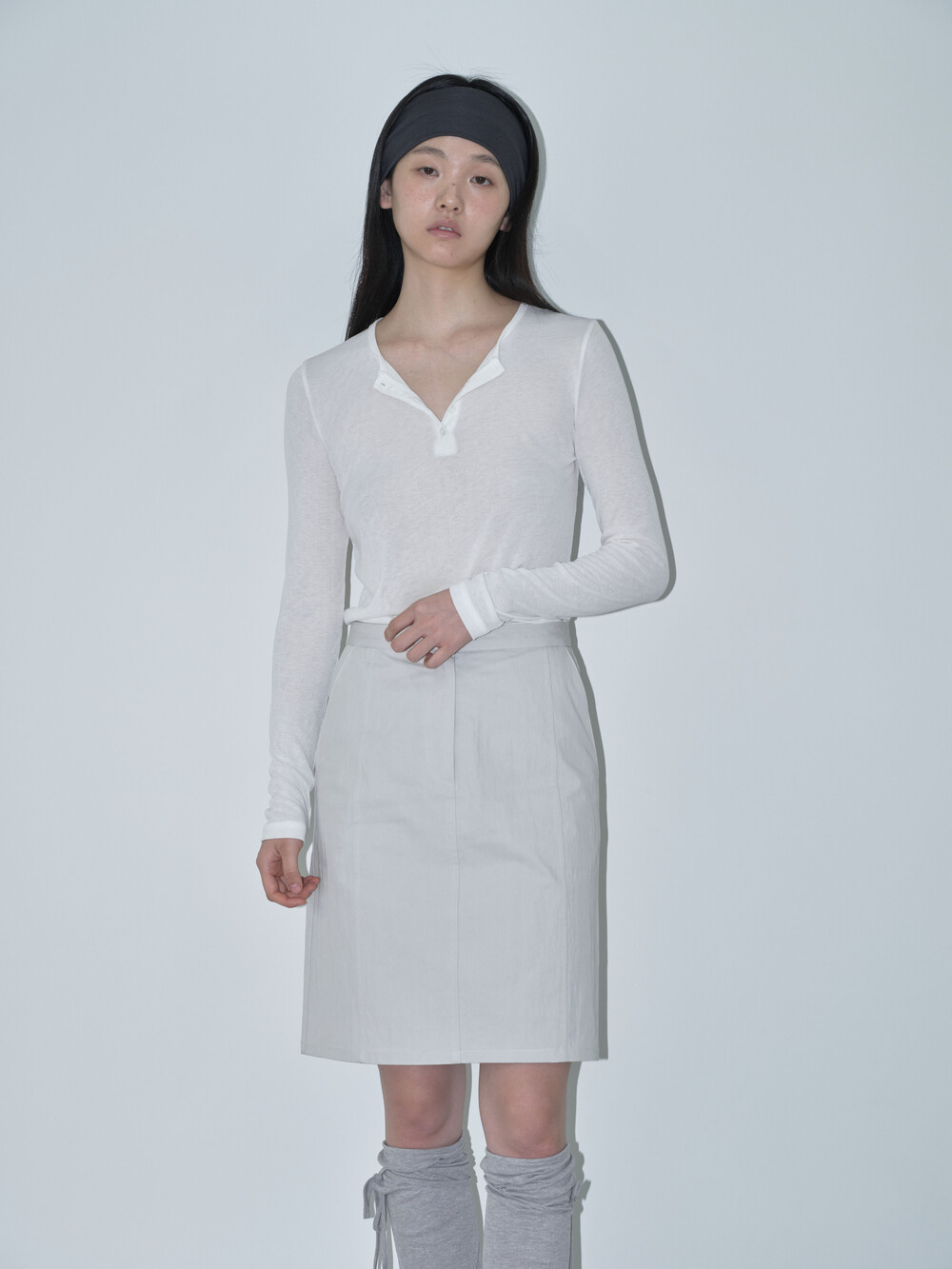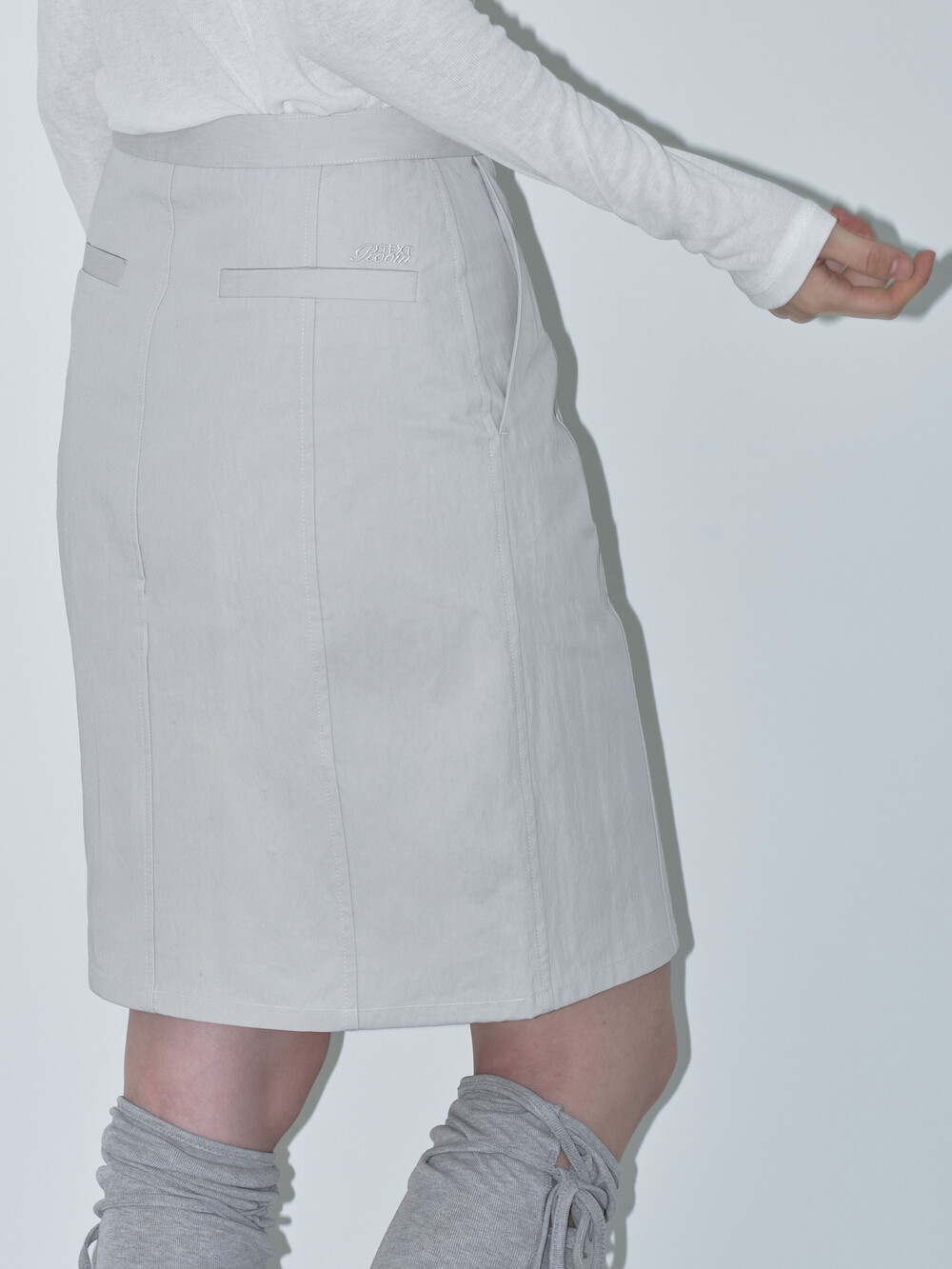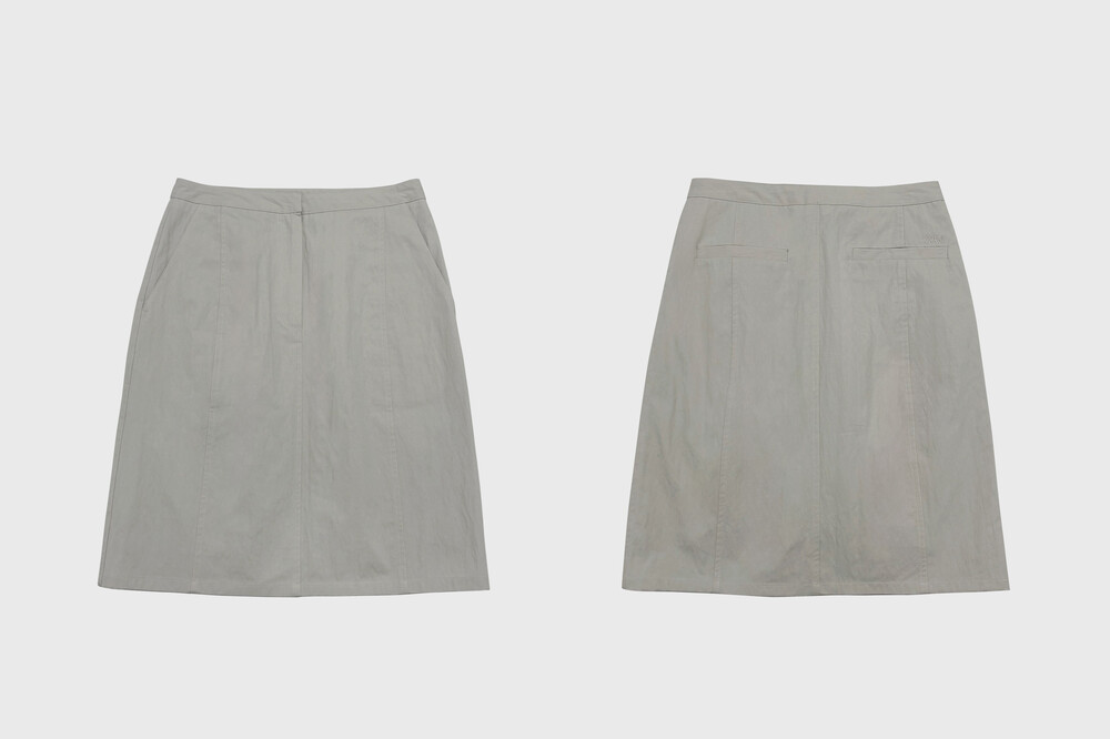 간절기에 시즌리스하게 착용할 수 있는 미디스커트입니다. 고밀도 원사로 짜여진 면-나일론 혼합 소재를 사용해 바스락거리는 질감과 자연스러운 링클감이 특징입니다.