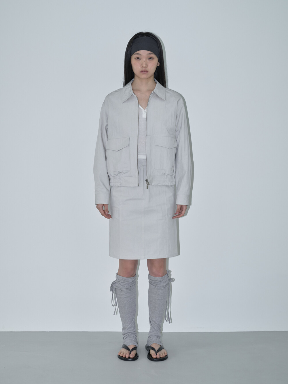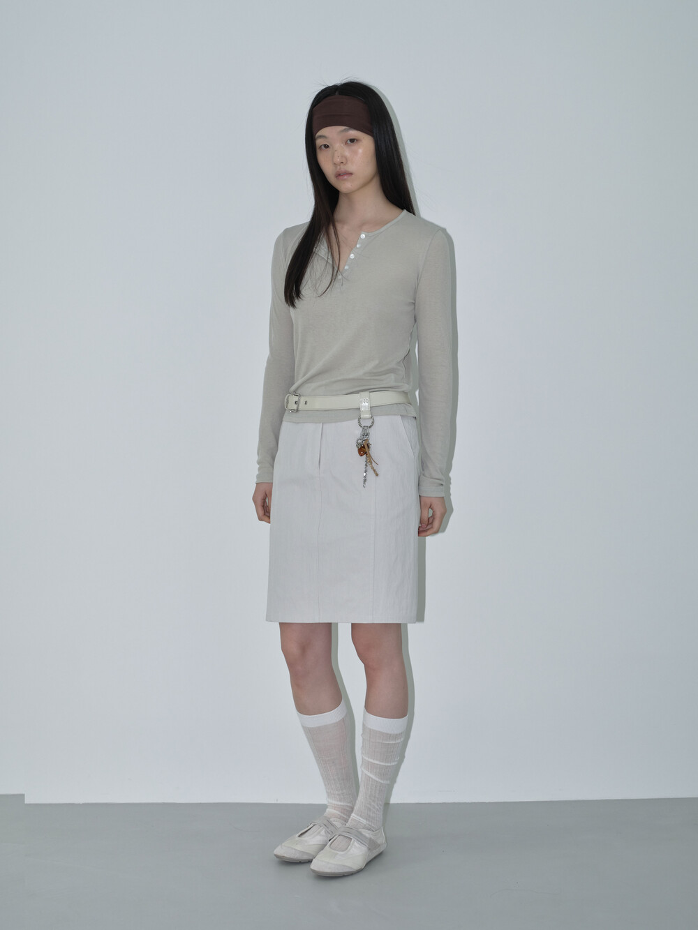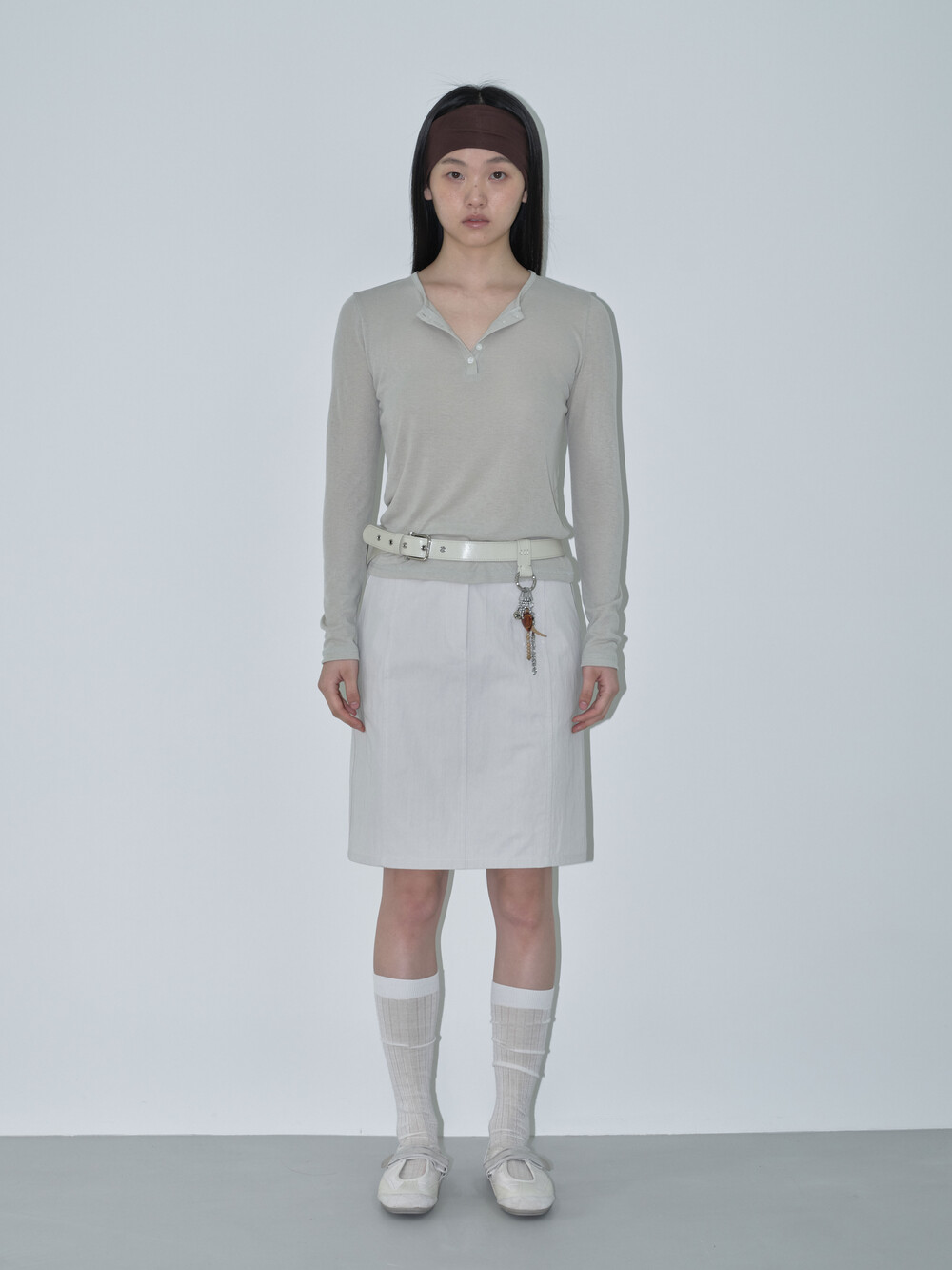 간절기에 시즌리스하게 착용할 수 있는 미디스커트입니다. 고밀도 원사로 짜여진 면-나일론 혼합 소재를 사용해 바스락거리는 질감과 자연스러운 링클감이 특징입니다.