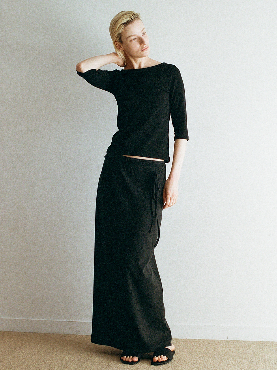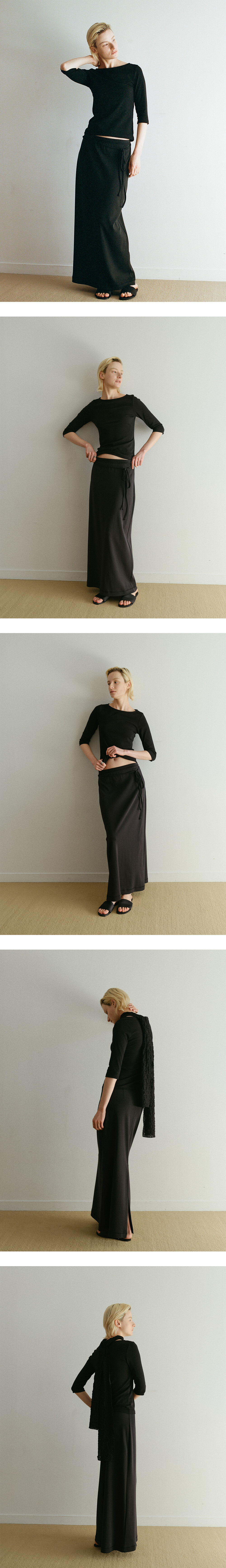 밀도 높고 매끄럽게 정돈된 외관의 코튼 립 스트링 맥시 스커트입니다. 견고한 짜임이 바디라인을 유연하게 잡아주어 흐트러짐 없이 단정한 실루엣을 연출합니다. 가만히 머물 때는 곧게 떨어지는 스트레이트 핏을 유지하지만, 걸음을 내디딜 때는 후면의 여유 있는 트임과 함께 세미 A라인으로 퍼지며 우아한 무드를 자아냅니다.