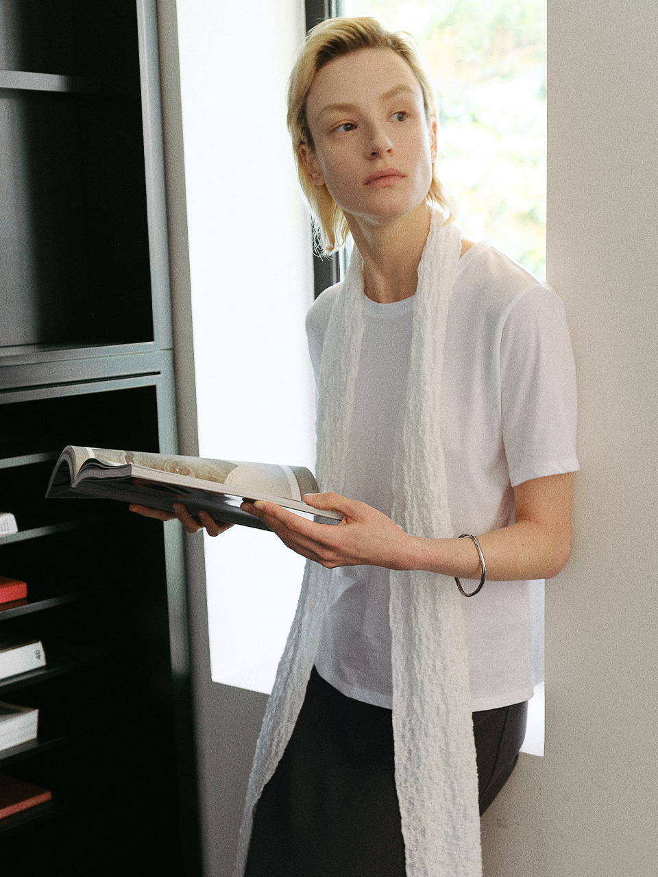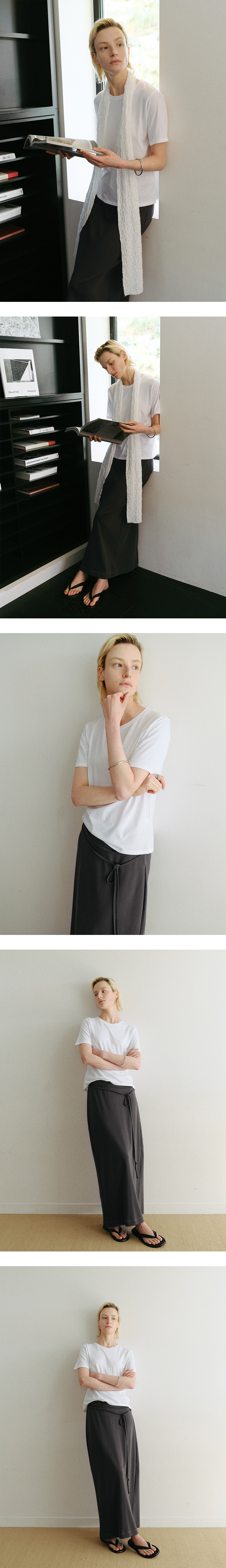 과하지 않은 스탠다드 핏과 부담 없는 반팔 기장으로 단독 착용은 물론 다양한 아우터와도 자연스럽게 어우러집니다. 뒷중심 절개 라인에는 지그재그 스티치를 더해 미니멀한 디자인 속에 은은한 포인트를 더했습니다.